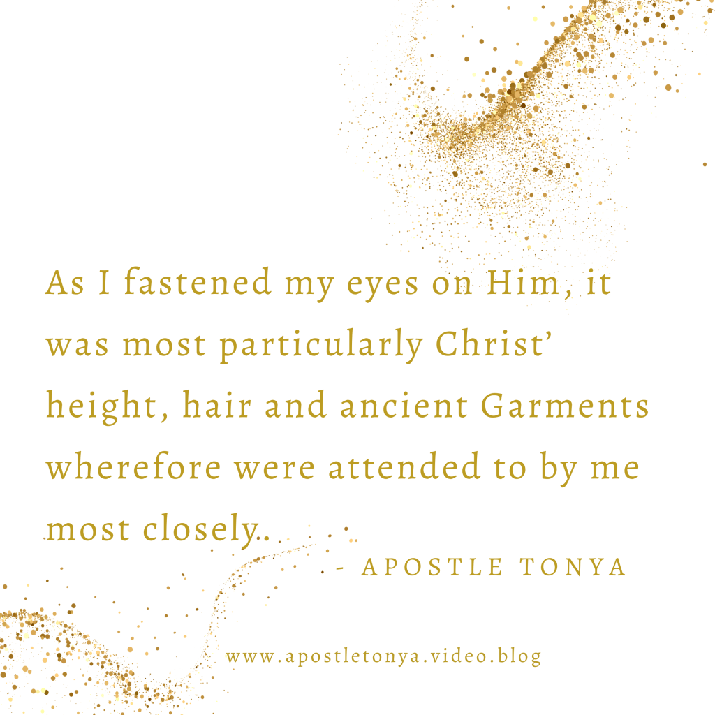 In the dream, I was an eyewitness of our most Wonderful Counsellor as He walked throughout a building on the earth.  And, how mighty was it?  For Christ Jesus walked among His Children in present day. As I fastened my eyes on Him, it was most particularly Christ’ Height, Hair and ancient Garments which were attended to by me most closely.  Our Risen Christ gloriously appeared to be a Man who was approximately six-feet tall.  Our Lord was silent. Â