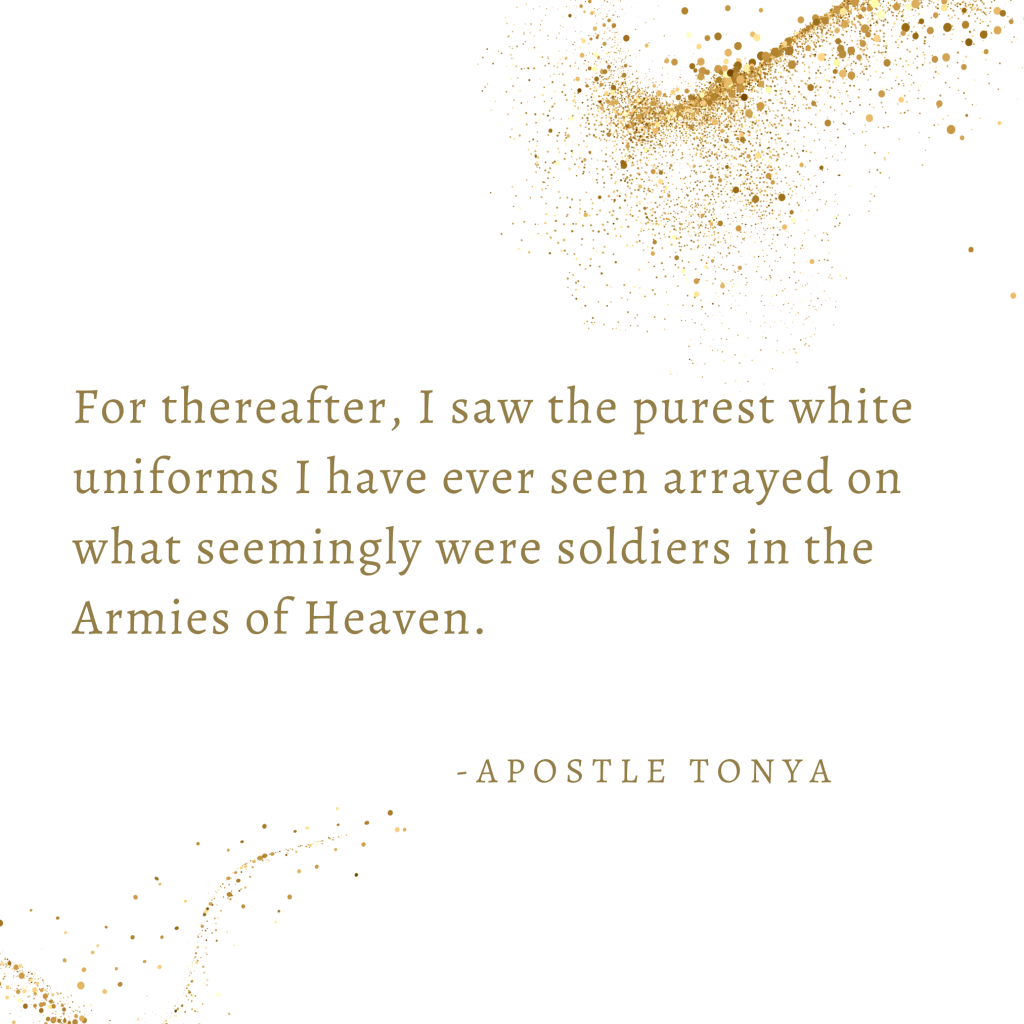 Surely, this most holy and spectacular occasion with our Holy Lord continued to keepeth me in awe. For thereafter, I saw the purest white uniforms I have ever seen arrayed on what seemingly were soldiers in the Armies of Heaven.