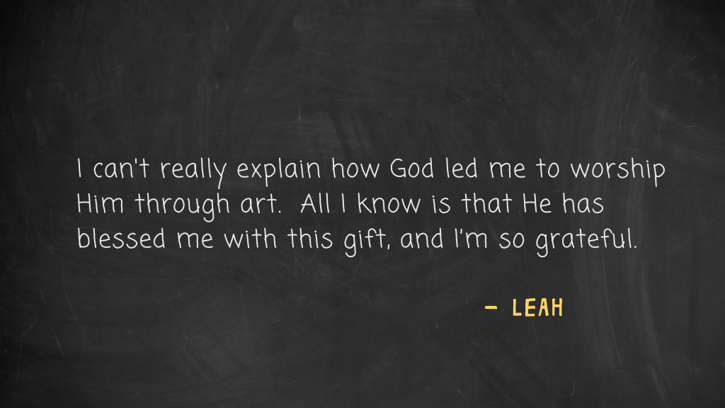 Leah: I can’t really explain how God led me to worship Him through art. All I know is that He has blessed me with this gift, and I’m so grateful.