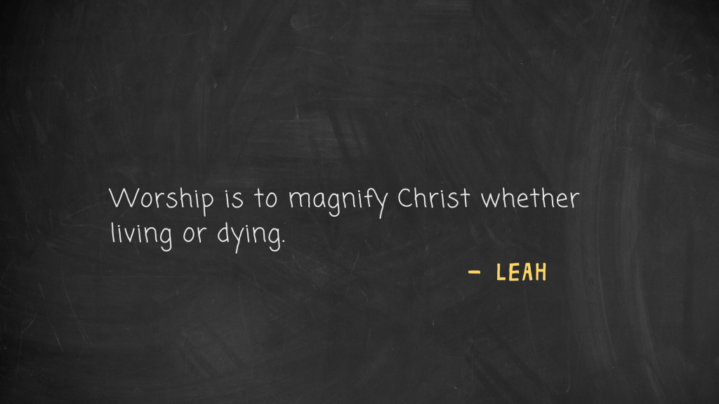 Leah: Worship to me is to magnify Christ whether living or dying. I see worship as revealing Christ as He is: magnificent and exalting Him in every part of my life. And worship prepares me for my everyday life because worshipping helps me to overcome any challenges and obstacles I may face daily.